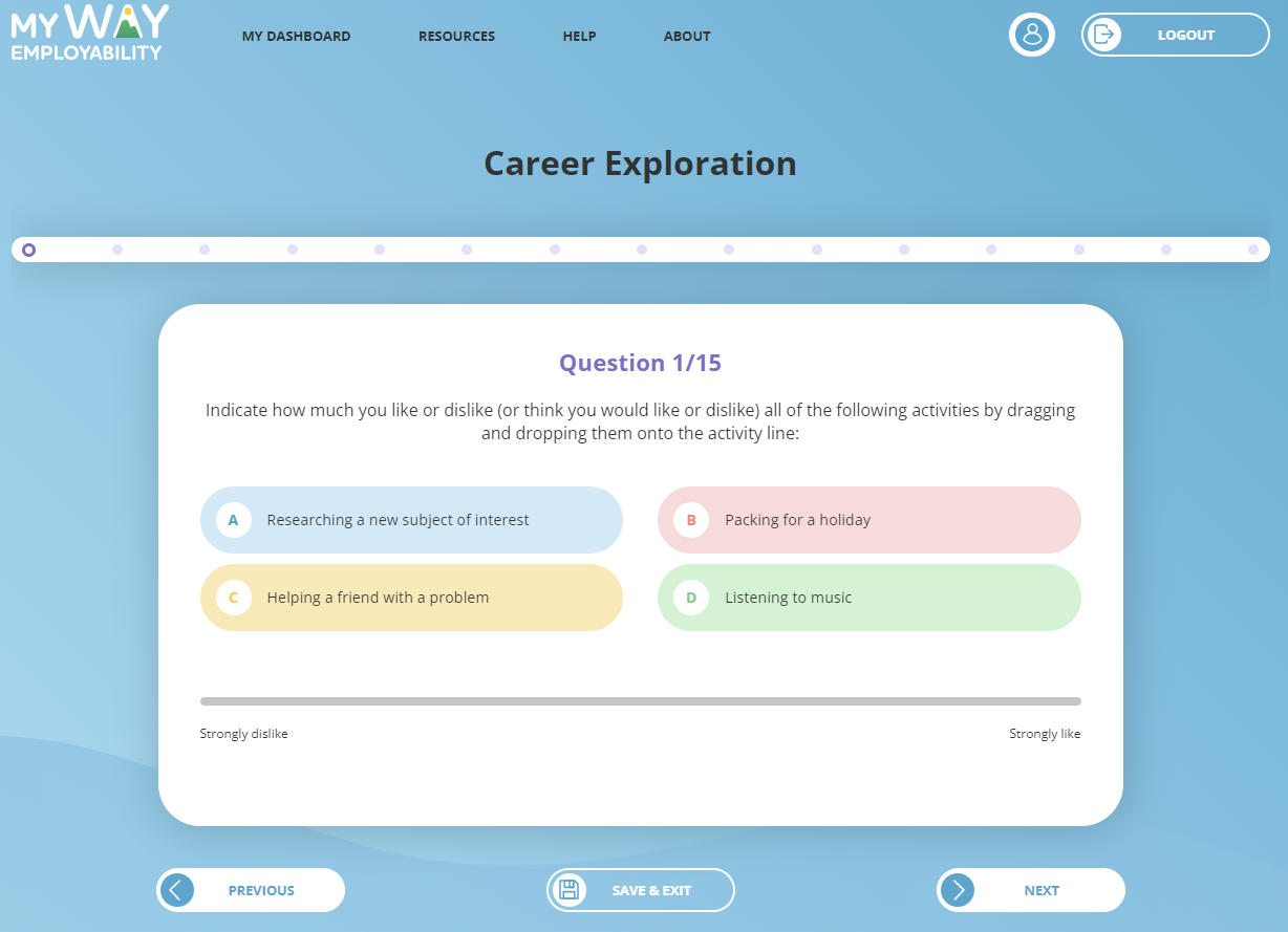 The Career Exploration section helps students establish the types of career areas they’d most enjoy. The Career Exploration quiz offers various activities on a sliding scale for students to rank how much they like or dislike activities. These activities are from categories based on the Holland codes (also known as RIASEC personality types) of organised, helping, enterprising, investigative, artistic, and practical.